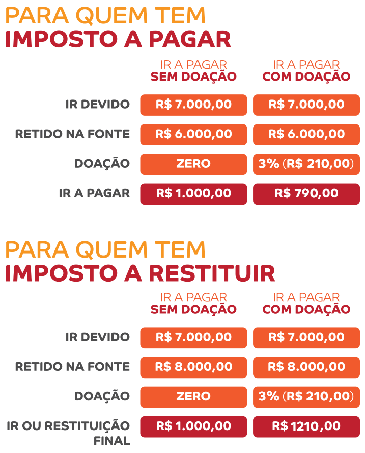 Você pode realizar sua doação tendo imposto a pagar ou a restituir. Se tiver imposto a pagar, o valor doado será abatido do montante a ser pago. Caso tenha imposto a ser restituído, o valor será somado à sua restituição.
